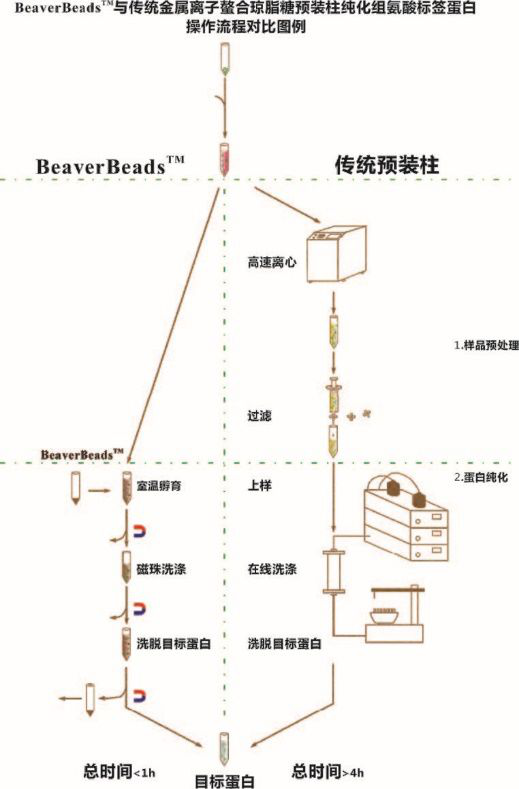 通過實驗流程的對比發(fā)現(xiàn),可以看出BeaverBeads™與金屬傳統(tǒng)離子鰲和瓊脂糖預(yù)裝柱純化組氨酸標(biāo)簽蛋白操作流程的優(yōu)化與效率的提升。