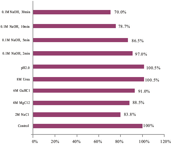 圖一、磁珠經(jīng)不同溶液處理后結(jié)合生物素化分子的活性