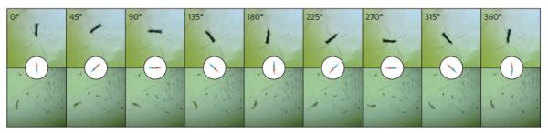 圖2. MagR在強(qiáng)磁場作用下指示南北,隨著磁場方向變化而改變自身方向。