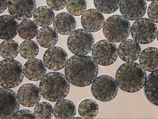 圖: BeaverBeads™ IDA-Nickel顯微鏡中形貌。該磁珠產(chǎn)品微觀為球形,分散性良好。透明瓊脂糖微球中均勻分散磁性顆粒。